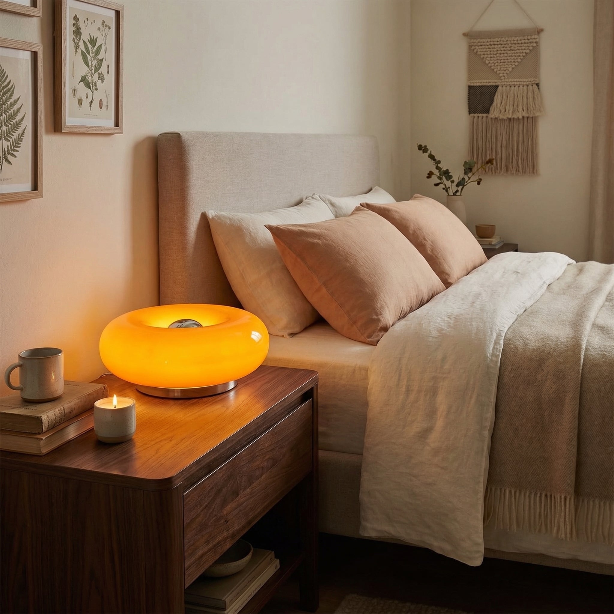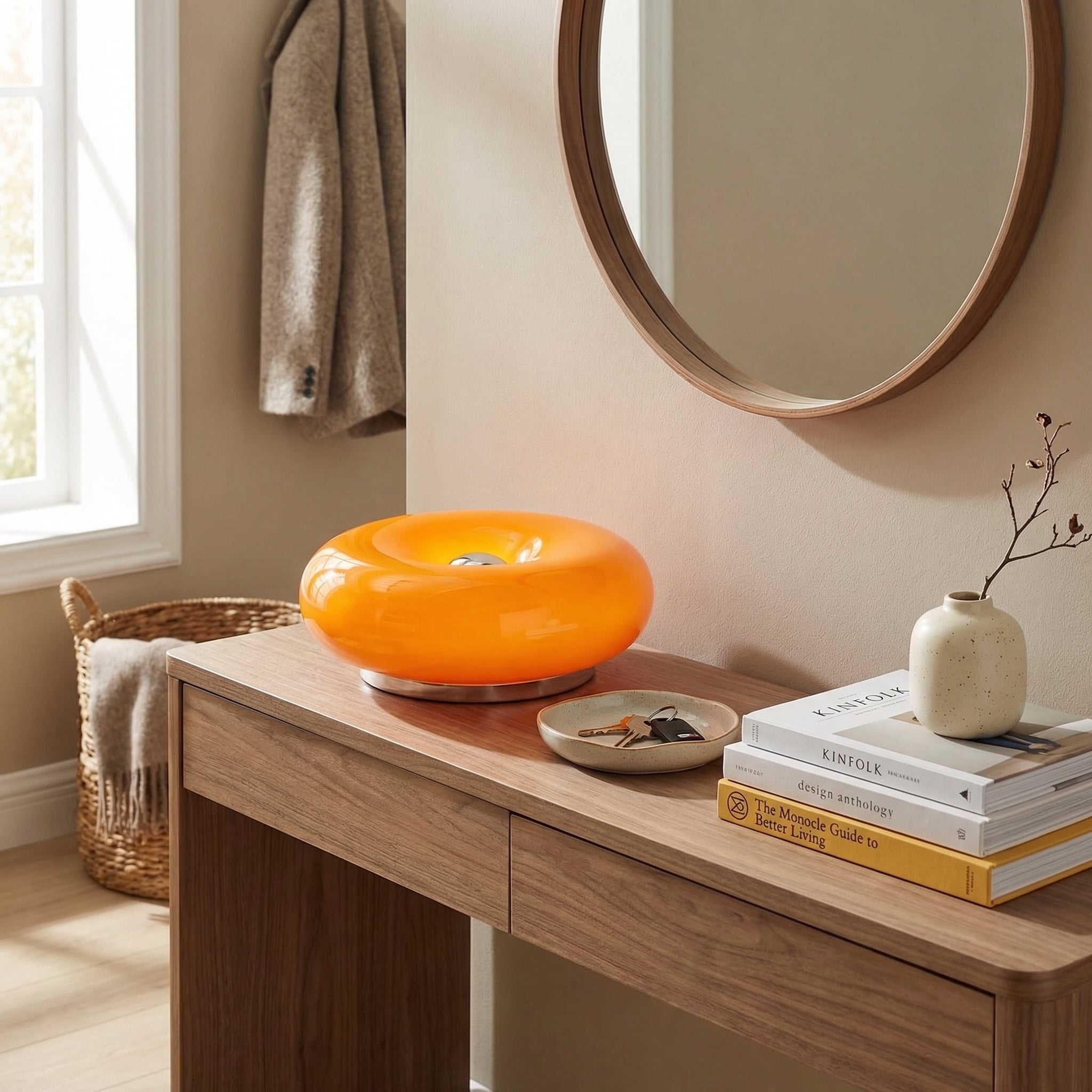 Donutförmige LED-Tischleuchte mit durchscheinendem orangefarbenem Glasfinish. Ideal, um einer zeitgenössischen oder eklektischen Inneneinrichtung eine verspielte und moderne Note zu verleihen.