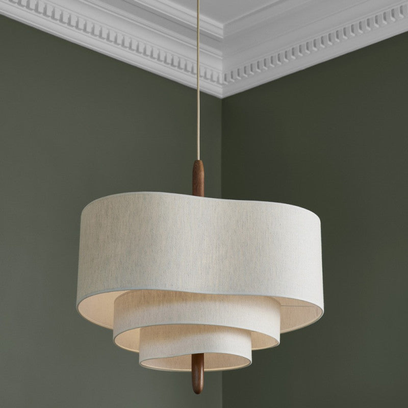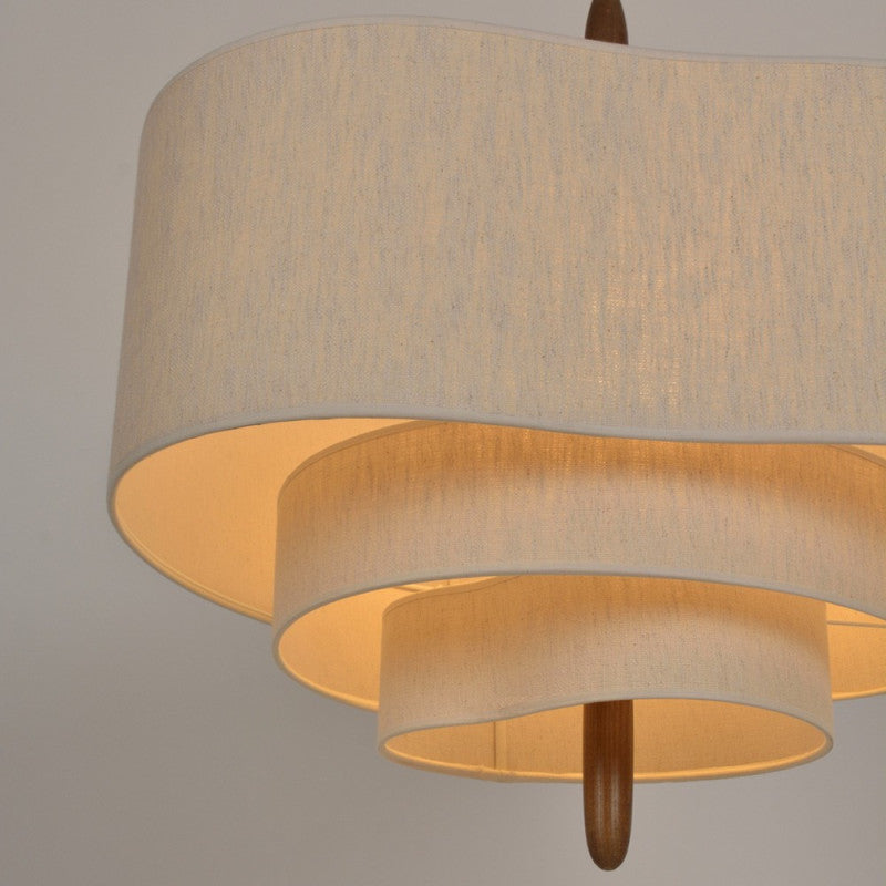 Mit ihren sich überlappenden Stoffringen erzeugt diese geschwungene Pendelleuchte in skulpturalem Design ein sanftes, warmes Licht. Sie eignet sich perfekt für Wohnzimmer, Schlafzimmer oder Esszimmer und vereint zeitgenössische Eleganz mit natürlichem Stil. Ideal, um eine beruhigende und stilvolle Atmosphäre zu schaffen.