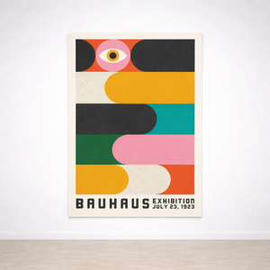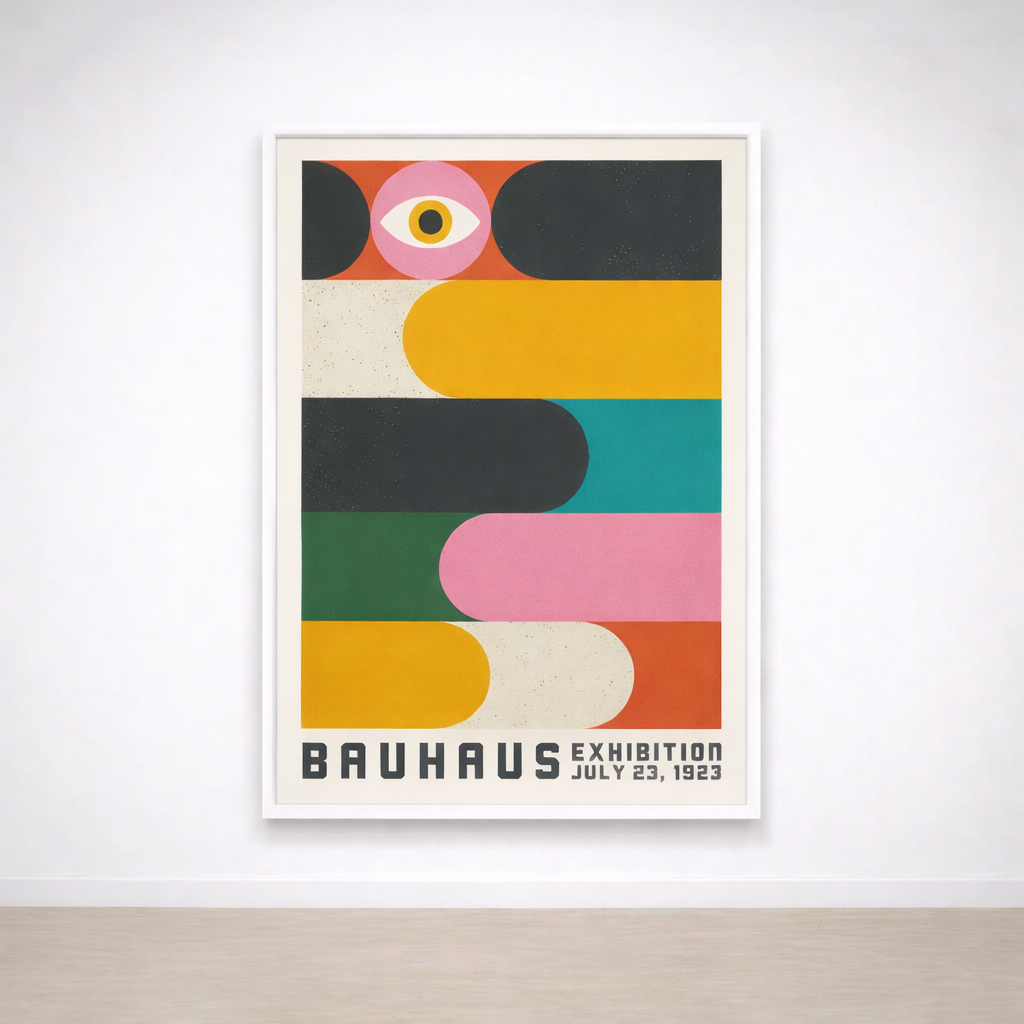 Ce tableau Bauhaus ultra graphique mixe des bandes arrondies et des aplats de couleurs pop (ocre, vert profond, bleu pétrole, rose poudré et terracotta) pour créer un rythme visuel dynamique et moderne. Le petit détail “œil” en haut ajoute une touche artistique et audacieuse, parfaite pour donner du caractère à un mur blanc.