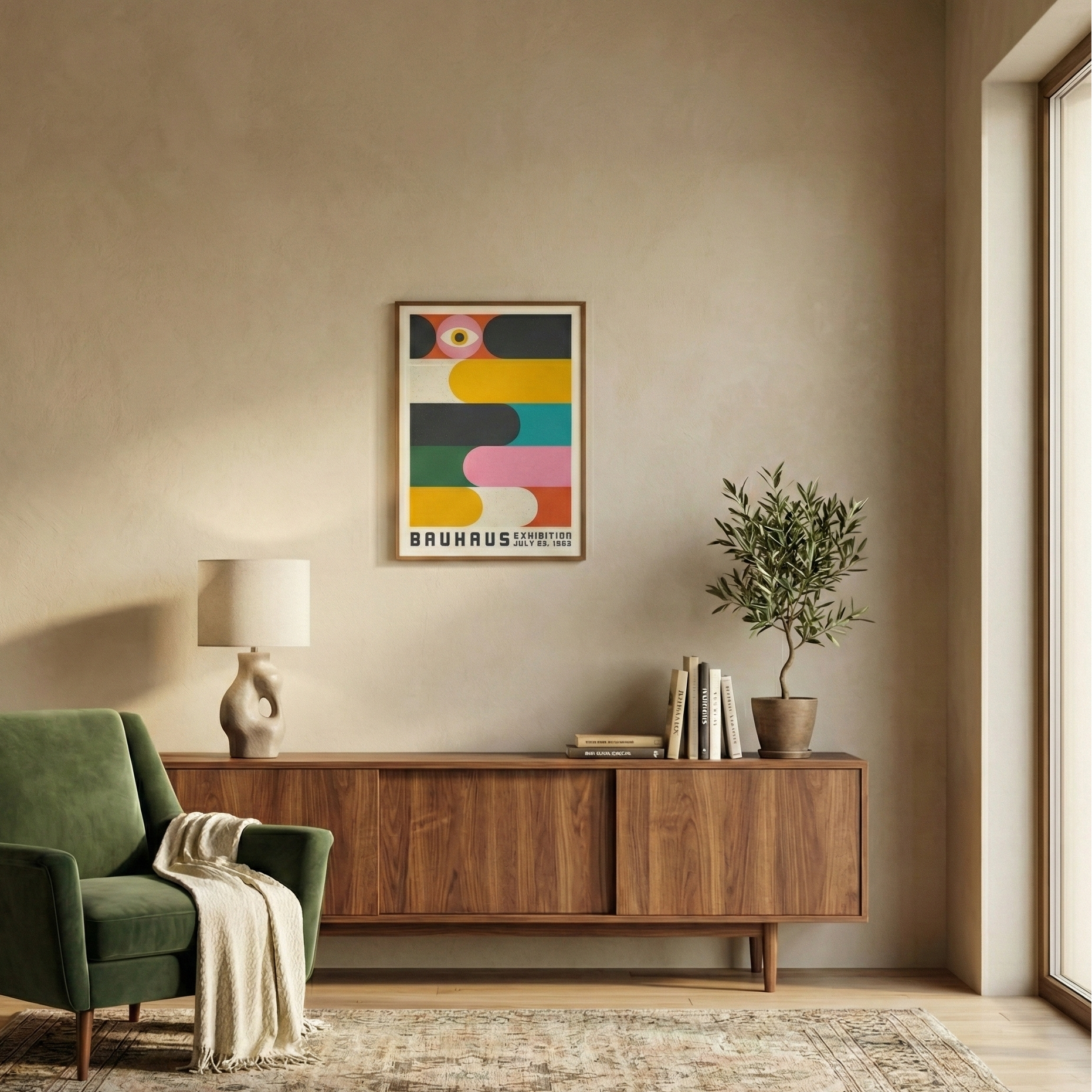 Idéal en décoration murale pour un salon contemporain, une chambre stylée ou un bureau créatif, ce poster abstrait style Bauhaus s’intègre aussi bien dans une déco scandinave, mid-century, rétro ou japandi. Une affiche design colorée qui apporte de la chaleur, de l’énergie et un vrai effet “wow” sans surcharger la pièce.