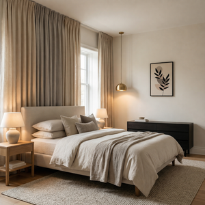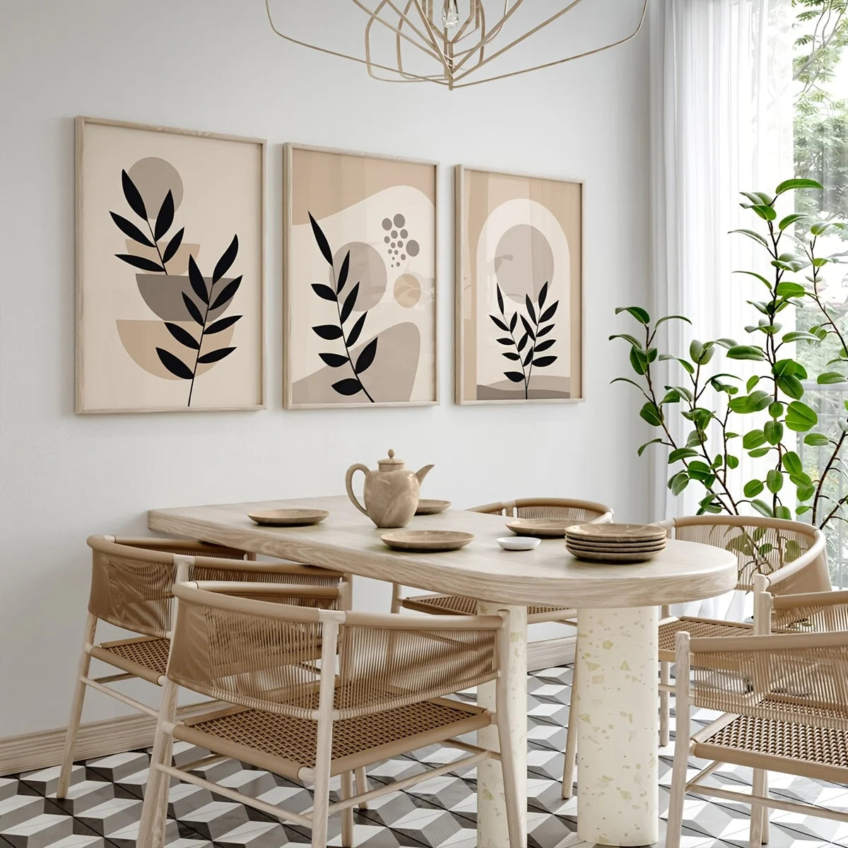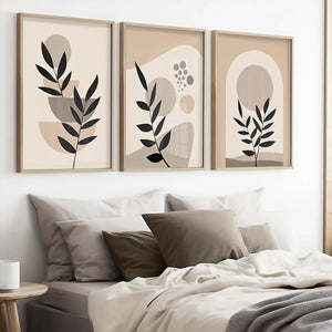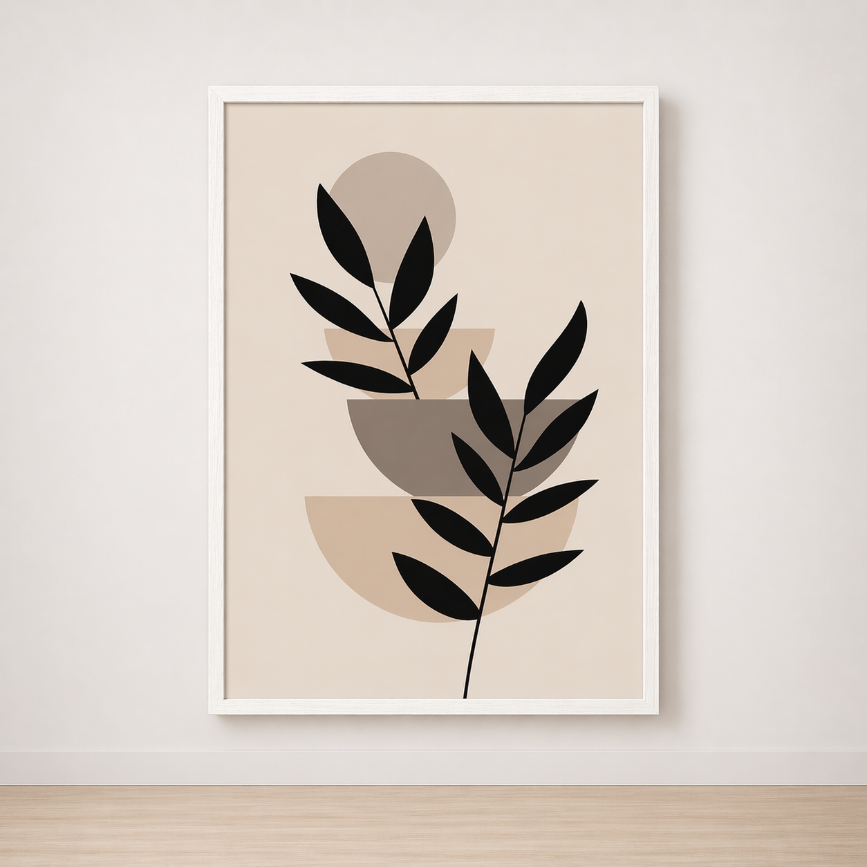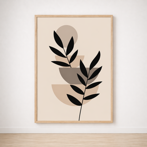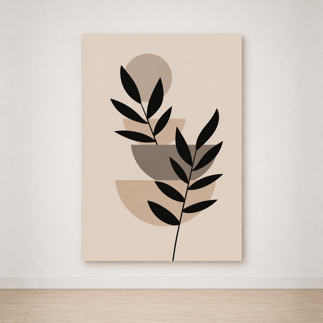 Ce tableau décoratif associe des feuilles noires aux lignes épurées à des formes géométriques beige sable et taupe, pour un rendu à la fois moderne, équilibré et apaisant. Le contraste entre les éléments organiques et les courbes abstraites crée une composition visuelle douce, idéale pour apporter du relief et une touche artistique à votre intérieur. Une pièce murale élégante qui inspire le calme et la simplicité.