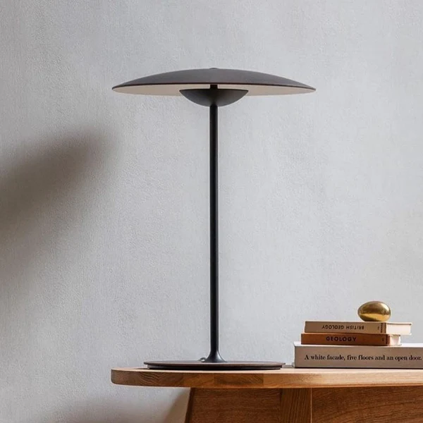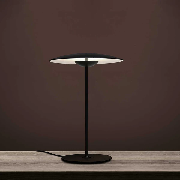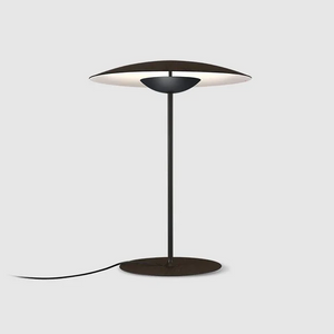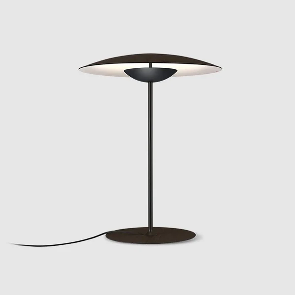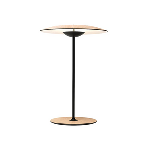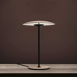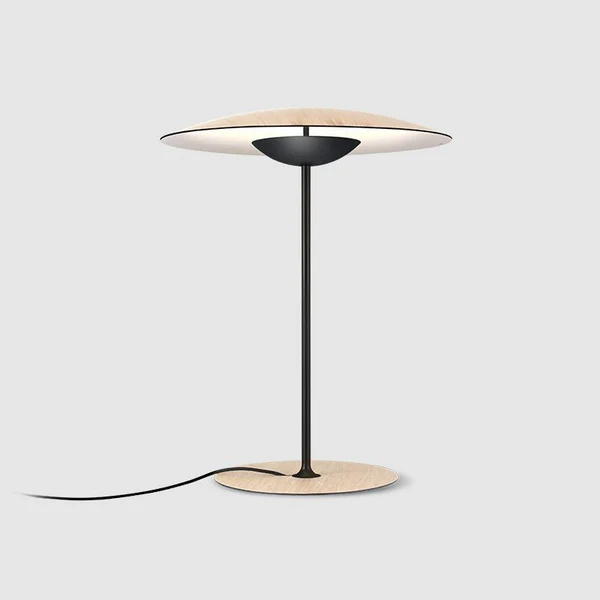 Cette lampe à poser se distingue par son diffuseur plat en métal jaune clair évoquant le bois et sa base coordonnée, soutenus par une tige fine en métal noir. Son design minimaliste et équilibré en fait un objet aussi fonctionnel qu’élégant, idéal pour une table de travail, une console ou un salon épuré.