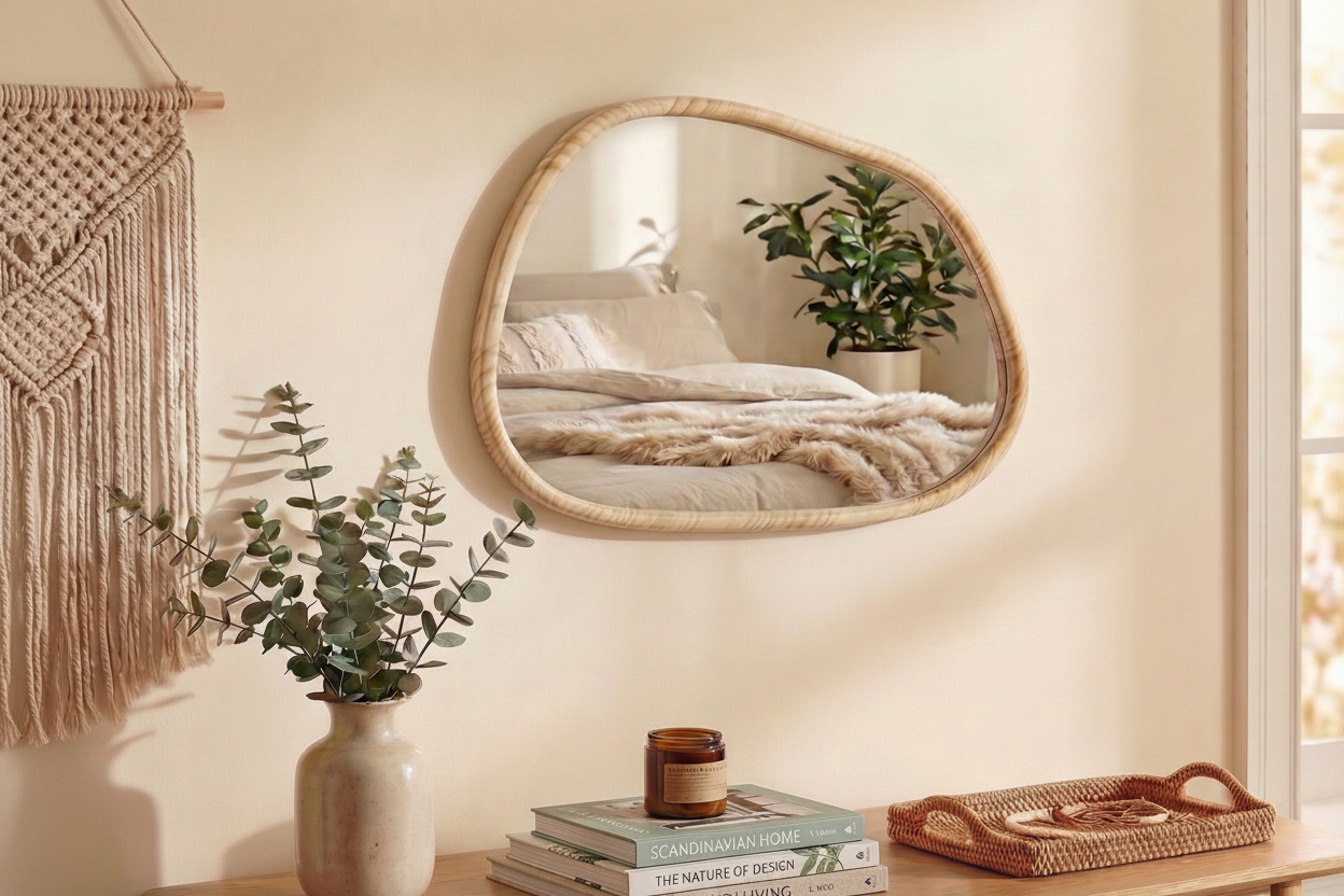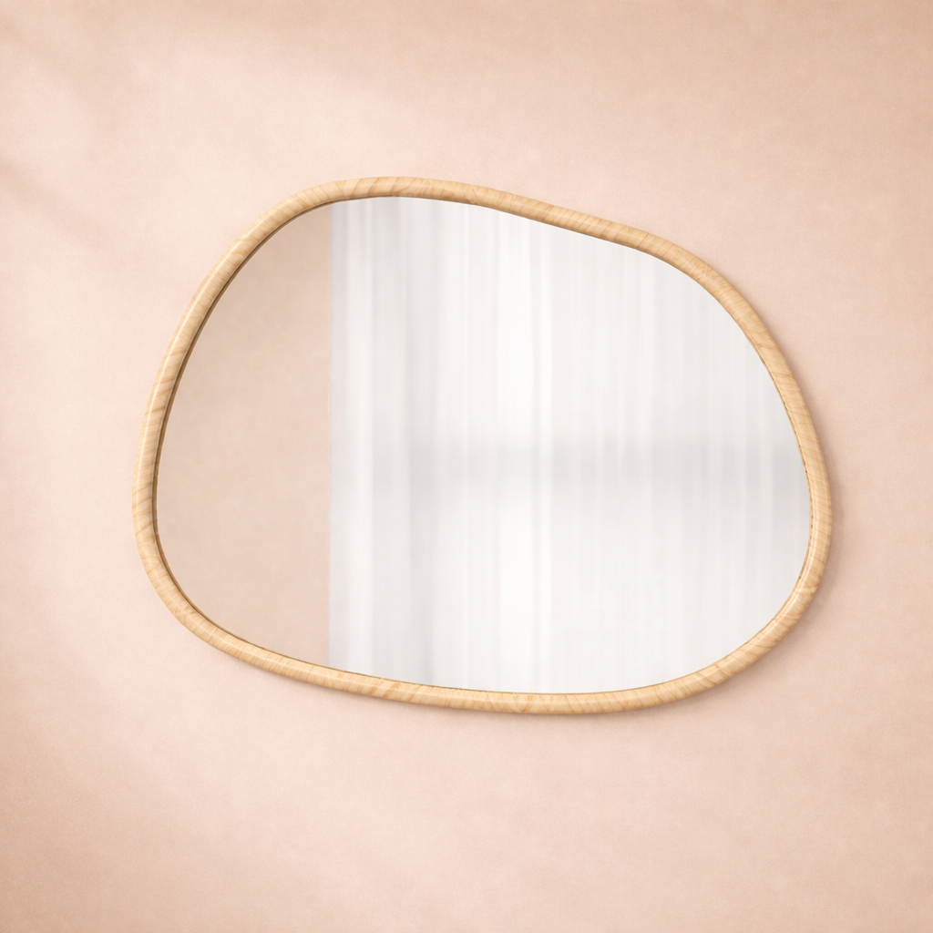 Avec sa forme organique irrégulière et son cadre en bois naturel, le miroir Loria apporte une touche moderne et élégante à votre intérieur. Il agrandit visuellement l’espace et s’intègre parfaitement dans une entrée, un salon, une chambre ou une salle de bain au style minimaliste, scandinave ou contemporain.