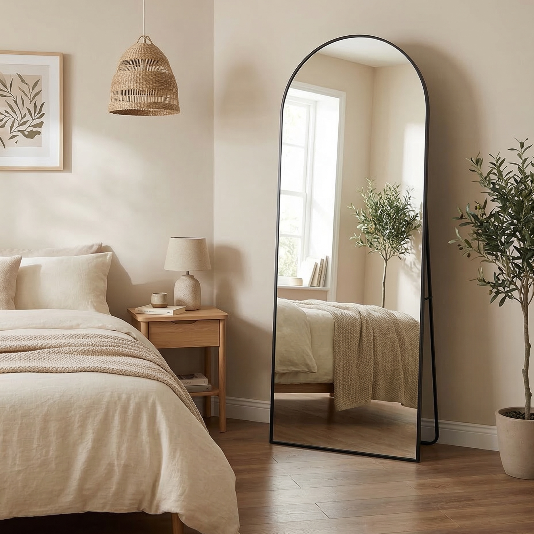 Son format plein pied permet de se voir confortablement sans prendre trop de place, ce qui en fait une solution idéale pour celles et ceux qui veulent un intérieur plus soigné sans gros changement. Son cadre en métal et son verre trempé renforcent ce rendu propre et moderne, tandis que son installation reste flexible selon la pièce : posé au sol, appuyé contre un mur ou fixé au mur.