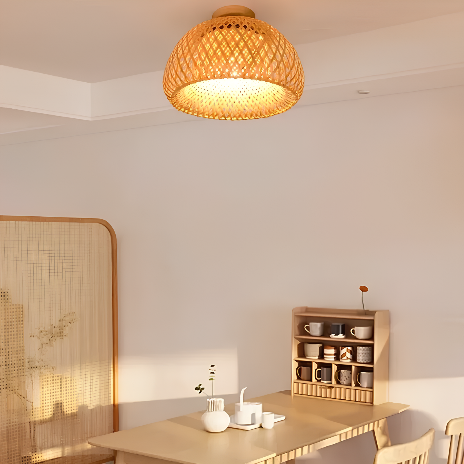 Ce plafonnier en rotin tressé à la main diffuse une lumière douce et apaisante, parfaite pour créer une atmosphère conviviale dans une cuisine, une salle à manger ou une entrée. Son design naturel et épuré s’intègre harmonieusement dans un intérieur bohème, scandinave ou japandi.