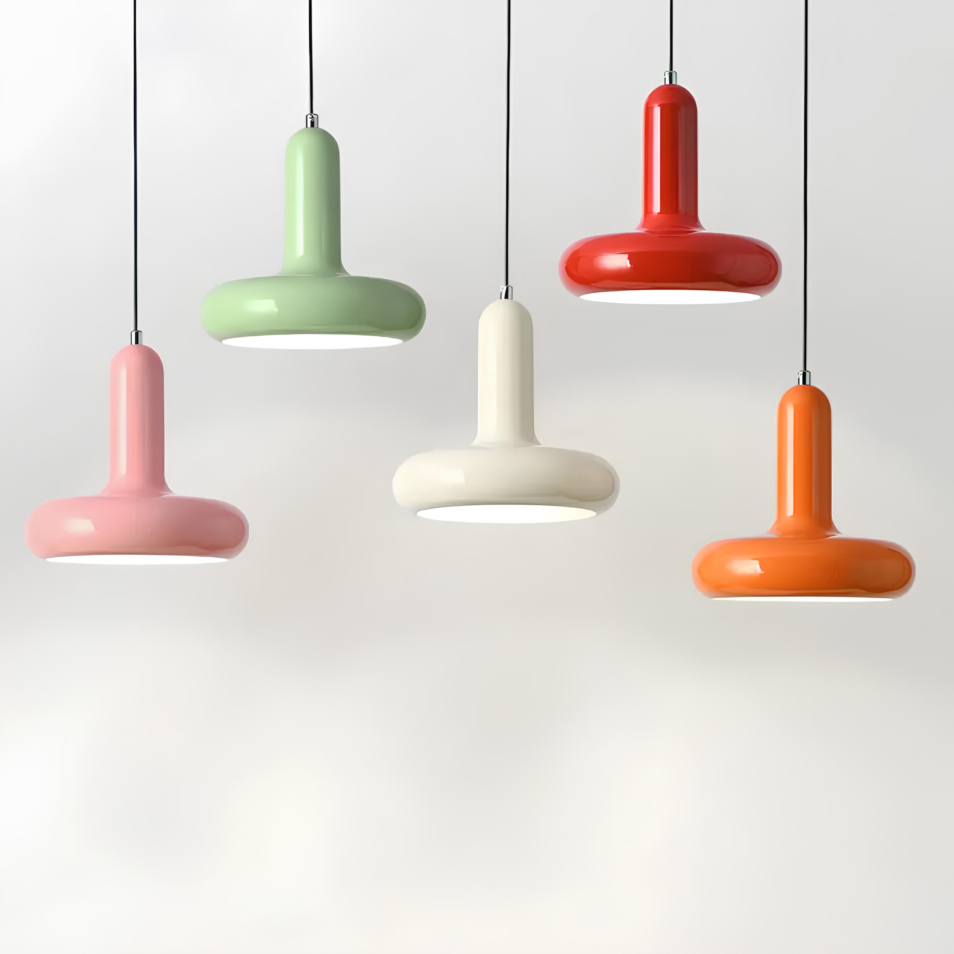 Ensemble de suspensions colorées au design rétro avec une finition brillante. Parfaites pour apporter une touche de dynamisme et de modernité à une cuisine, une salle à manger ou un espace créatif.