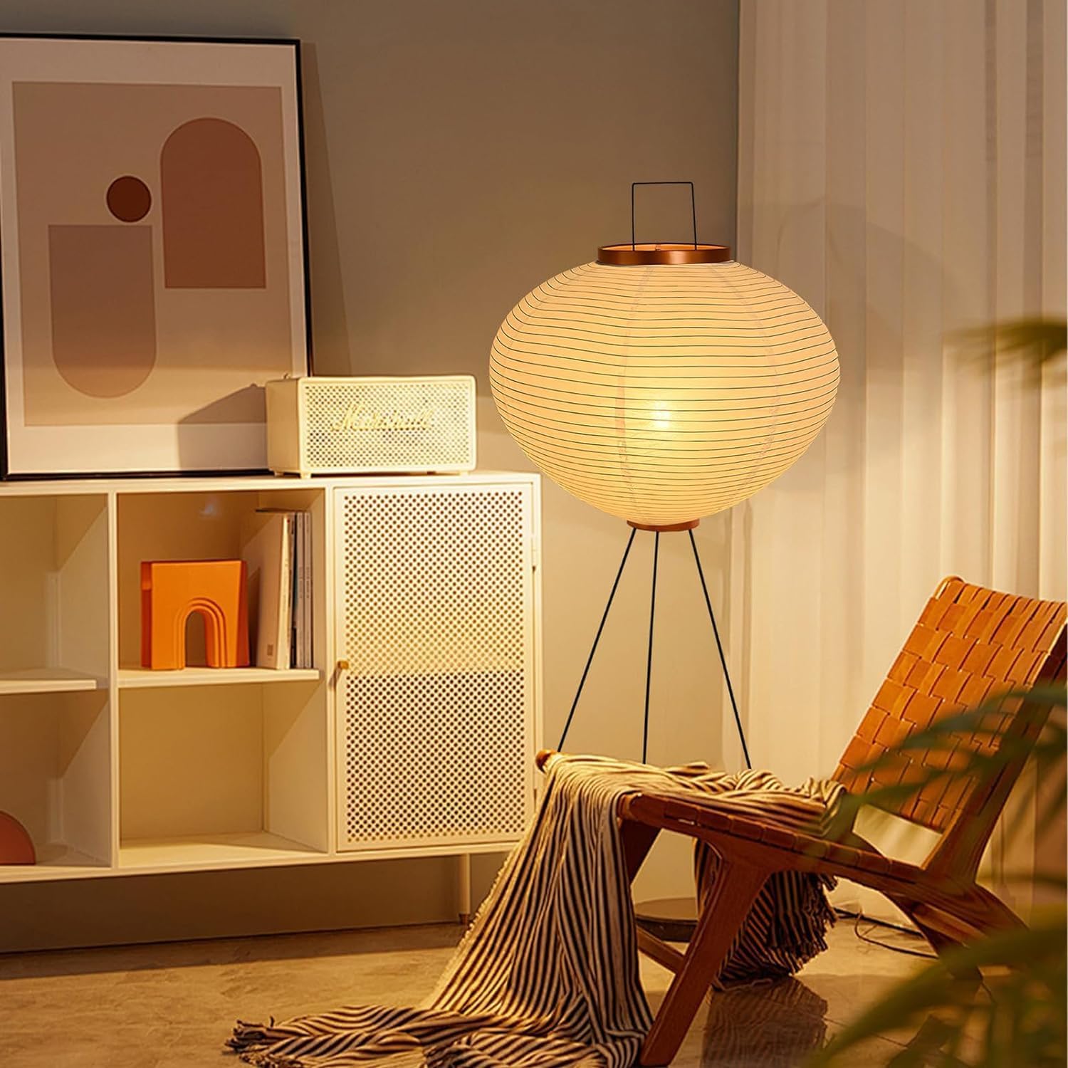 Ce lampadaire tripode s'inspire de l’esthétique japonaise pour offrir une lumière douce et enveloppante. Son abat-jour en papier façon lanterne diffuse une ambiance paisible, idéale pour un salon, une chambre ou un espace lecture. Monté sur des pieds fins en métal noir, il combine légèreté visuelle et stabilité.