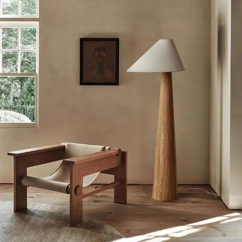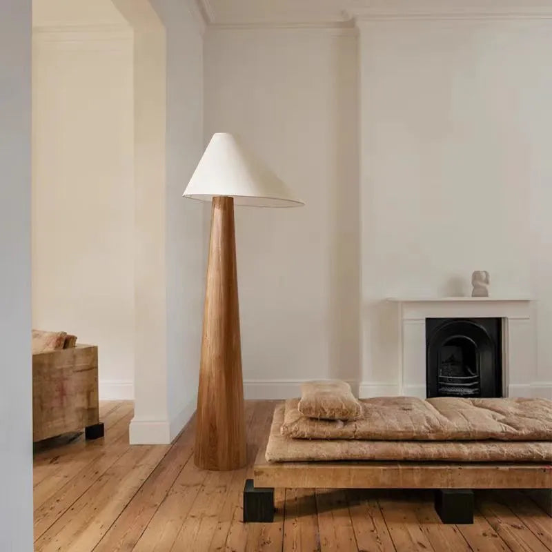 Apportez une touche de modernité naturelle à votre intérieur avec ce lampadaire en bois. Le design conique du pied, associé à un abat-jour incliné en tissu blanc, offre une esthétique minimaliste et élégante.