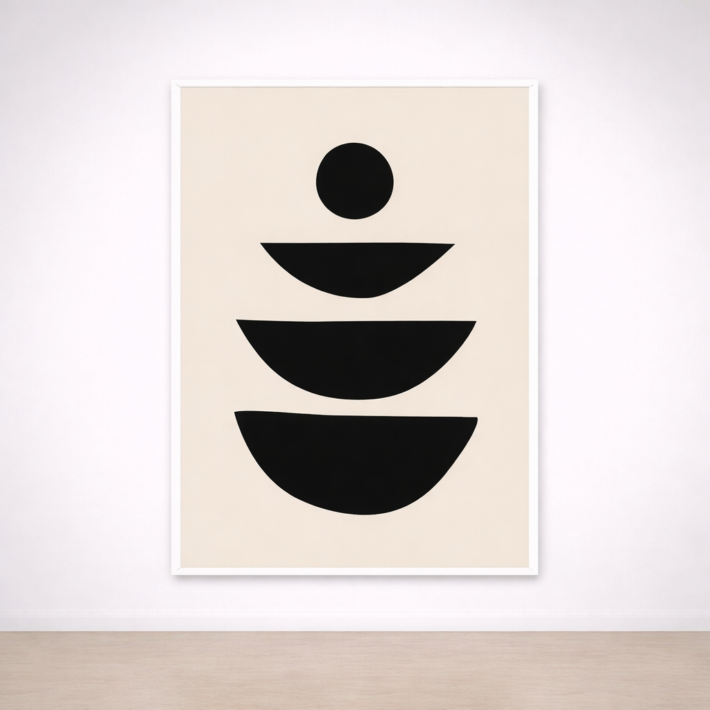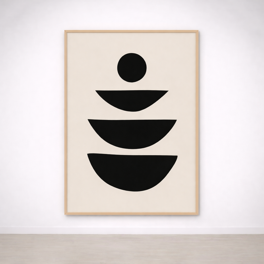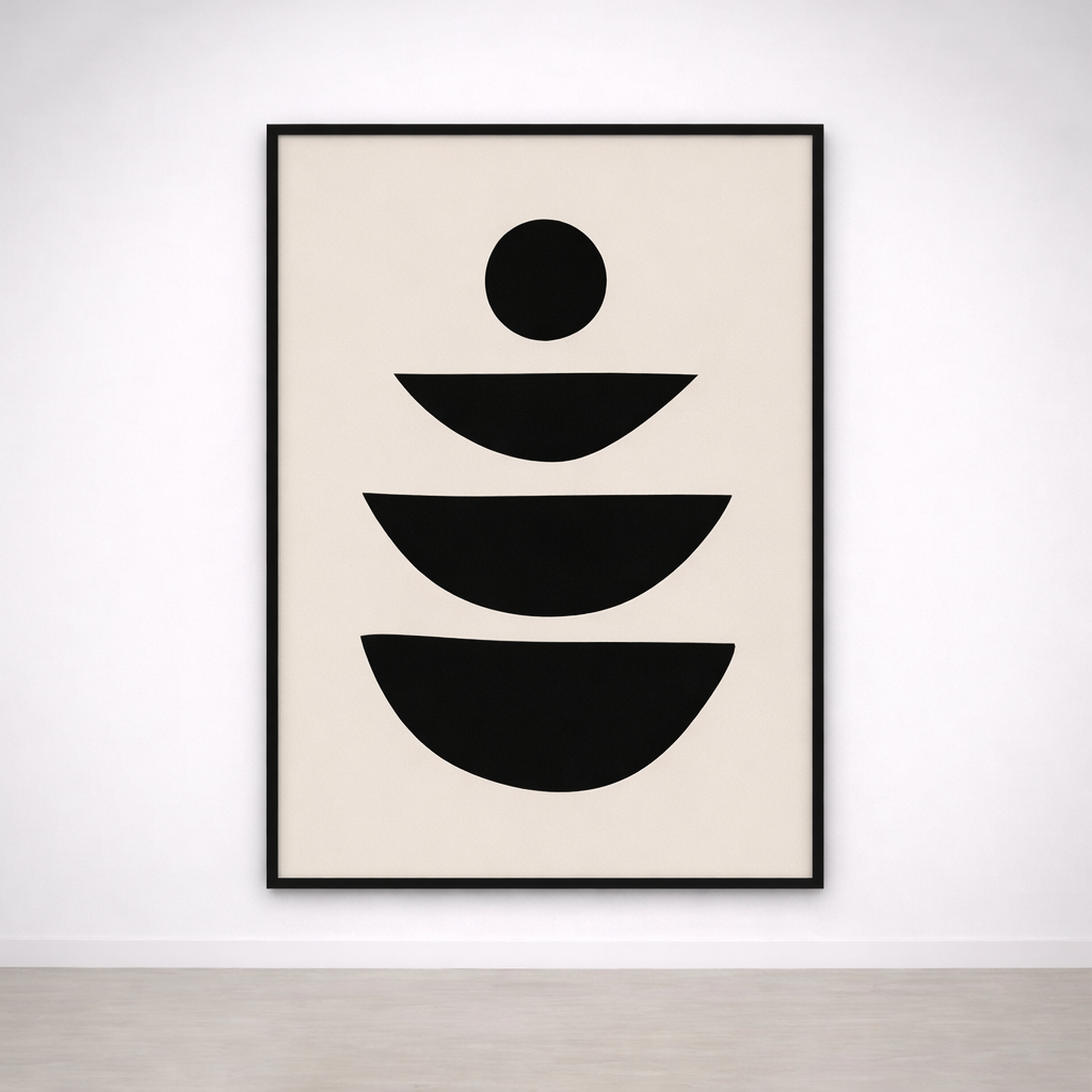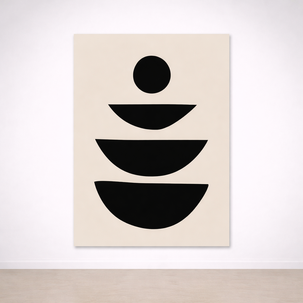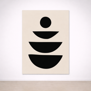 Ce tableau minimaliste met en scène des demi-cercles noirs empilés et un point central, comme une composition en équilibre parfait. Son design sobre et graphique apporte une sensation d’ordre, de calme et d’harmonie, idéal pour une décoration murale moderne sans surcharge visuelle.