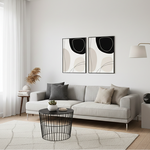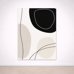 Ce tableau abstrait minimaliste associe de grandes formes organiques noir profond et beige sable, traversées par des lignes fines façon dessin au trait. Le contraste est élégant, moderne, et apporte une sensation de calme immédiat : parfait pour une déco épurée qui respire, sans perdre en caractère.