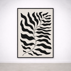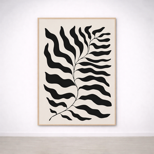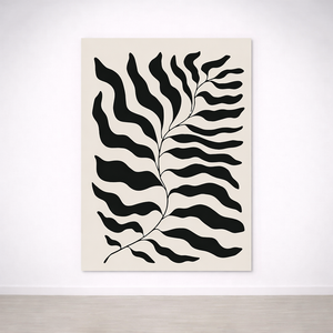 Ce tableau minimaliste représente une grande feuille stylisée aux courbes organiques, en noir profond sur fond beige doux. Son design végétal abstrait apporte du mouvement et une touche nature très chic, idéale pour réchauffer un mur tout en gardant une déco épurée et moderne.